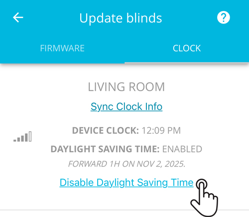 When enabled, this feature will automatically adjusts your blind’s schedule when daylight saving time starts or ends, keeping schedules perfectly in sync with local time.